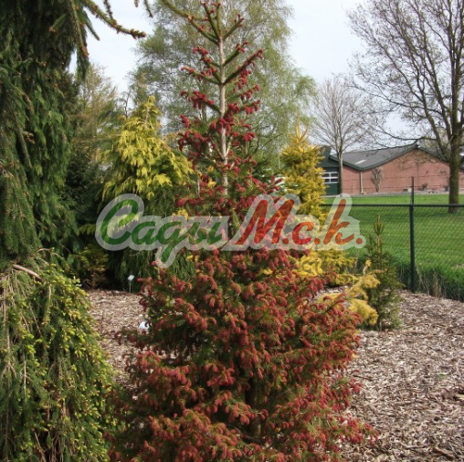 Ель восточная Aureospicata - хвойное вечнозеленое дерево конической формы. Крона плотная. Взрослая ель может достигать высоты 8-12 м и ширины 5 м. В возрасте 30 лет достигает 6-8 м высоты. В 10 лет высота около 2,5 м и 1,5 м в диаметре. Сорт является самым декоративным представителем елей восточных благодаря ярко-желтым молодым приростам, которые появляются позднее чем у других сортов ели, в июне мясяце. Вырастая, приросты становятся зелеными. Хвоя короткая, темно-зеленая, блестящая. Иголки короткие, жесткие.