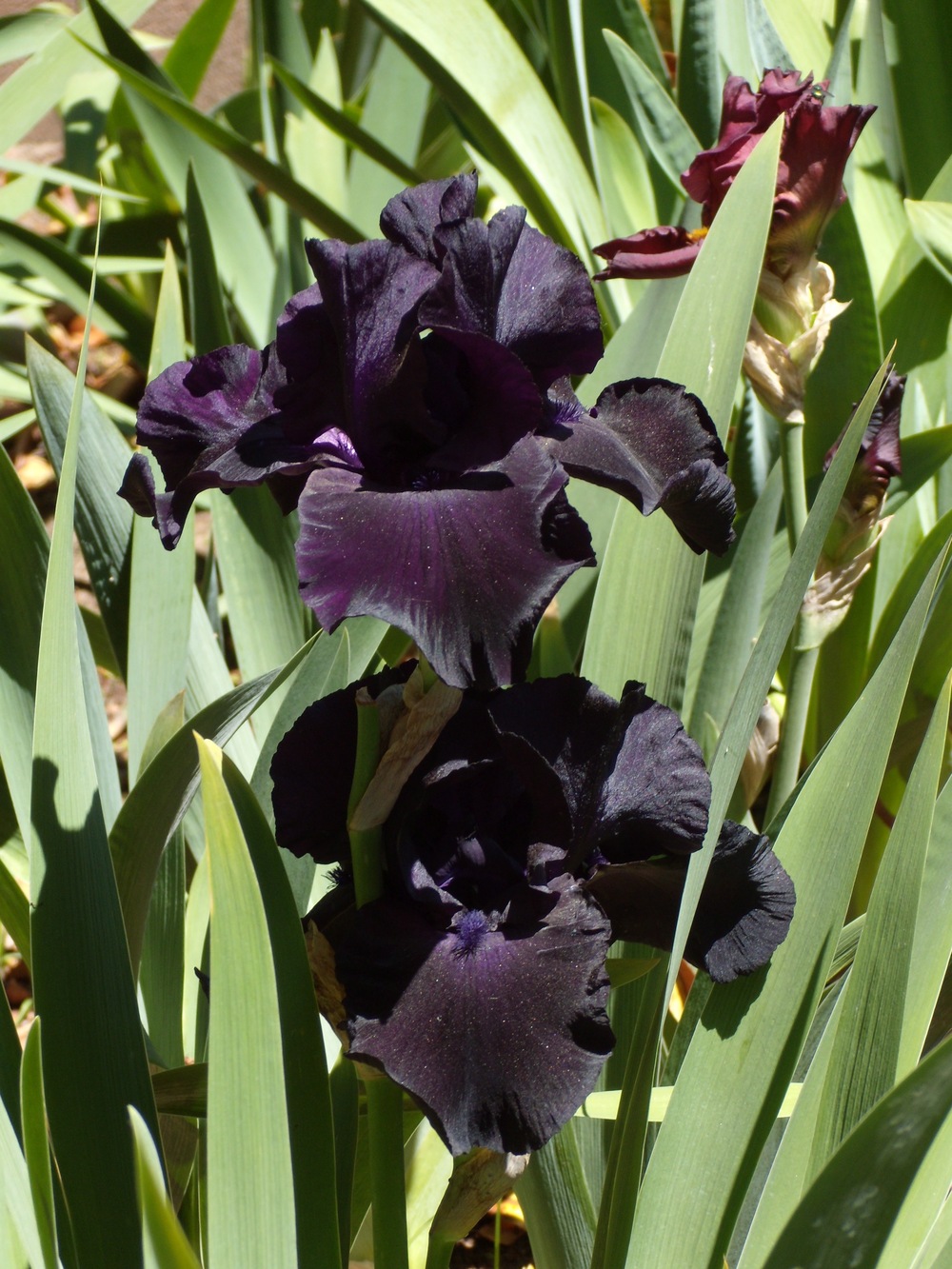 Ирис Black Suited самый чёрный среди высокорослых чёрных ирисов. Стандарты и фолы одинаково интенсивного чёрного цвета. Бородки тоже чёрные. Цветки изящные, умеренно волнистые. Срок цветения поздний.