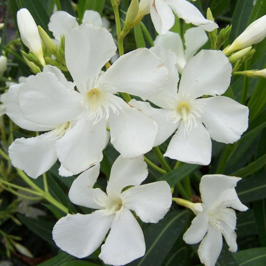 Олеандр обыкновенный Сестра Агнес (лат. Nerium oleander Soeur Agnes) - быстрорастущее дерево или кустарник высотой от 1,5 до 3-х метров, предпочитающий расти на солнце. Листья узкие, кожистые, темно-зеленые. Цветки простые, ароматные, чисто-белые со светло-желтым основанием. Внимание! Олеандр - ядовитое растение, поэтому при его культивировании требуется осторожность.
